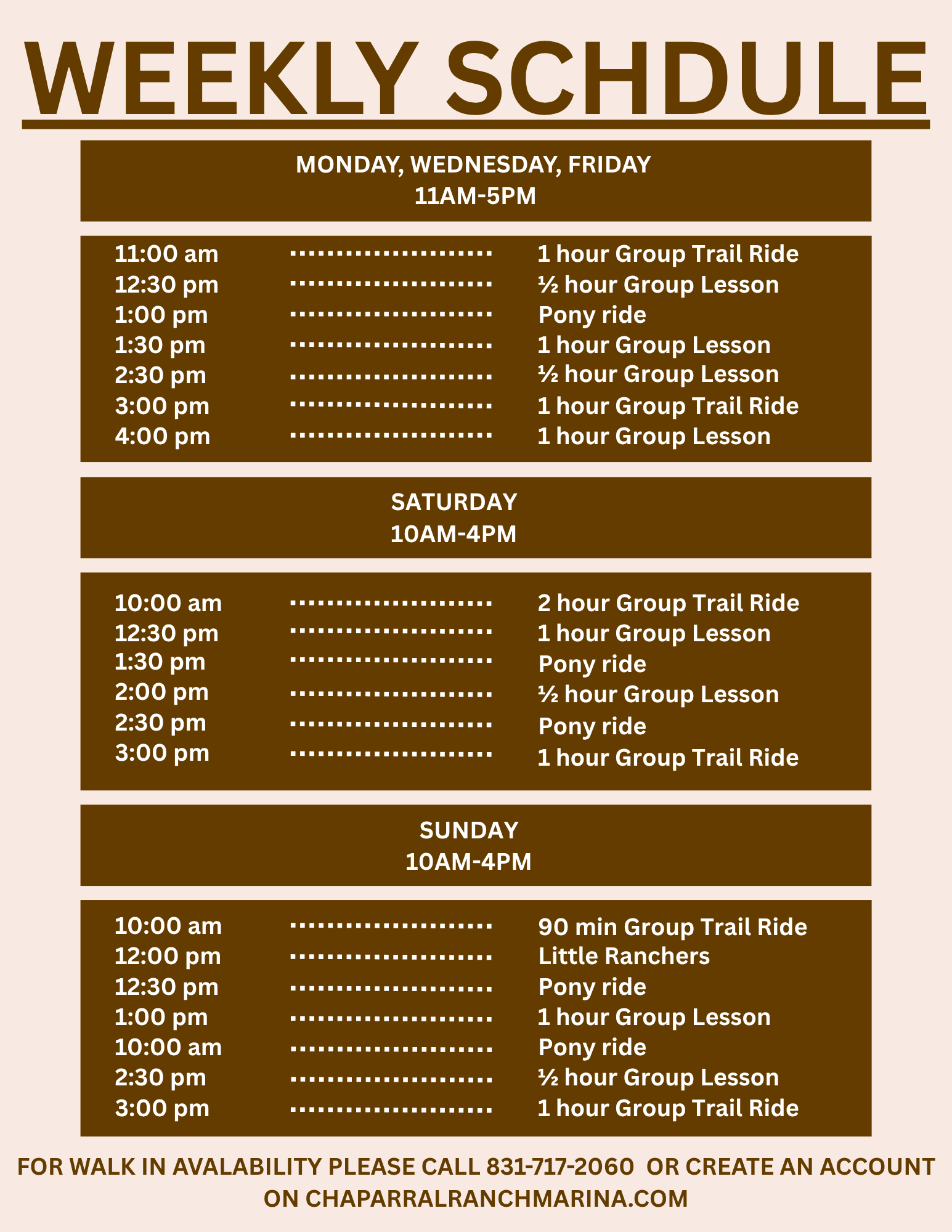 If you do not see a time that works for you, please email info@chaparralranchmarina.com or call